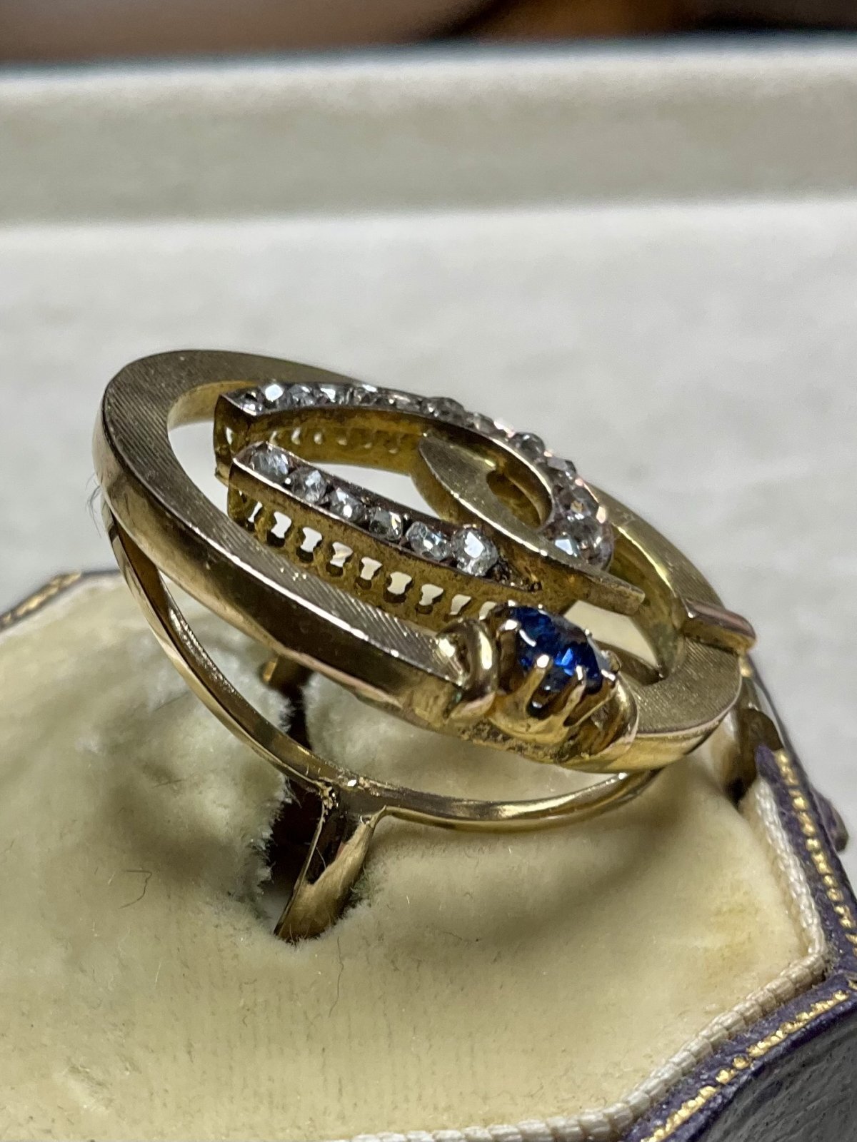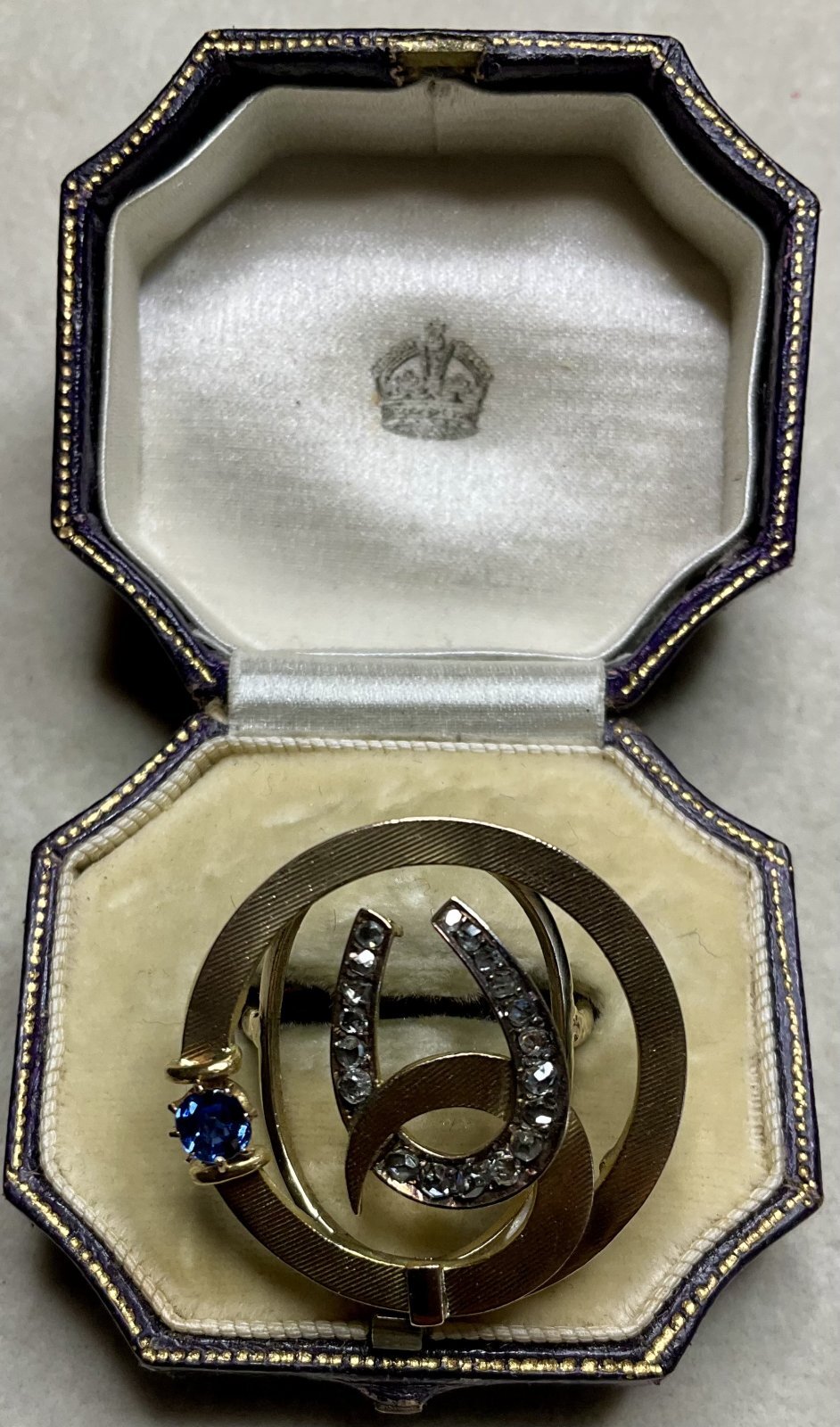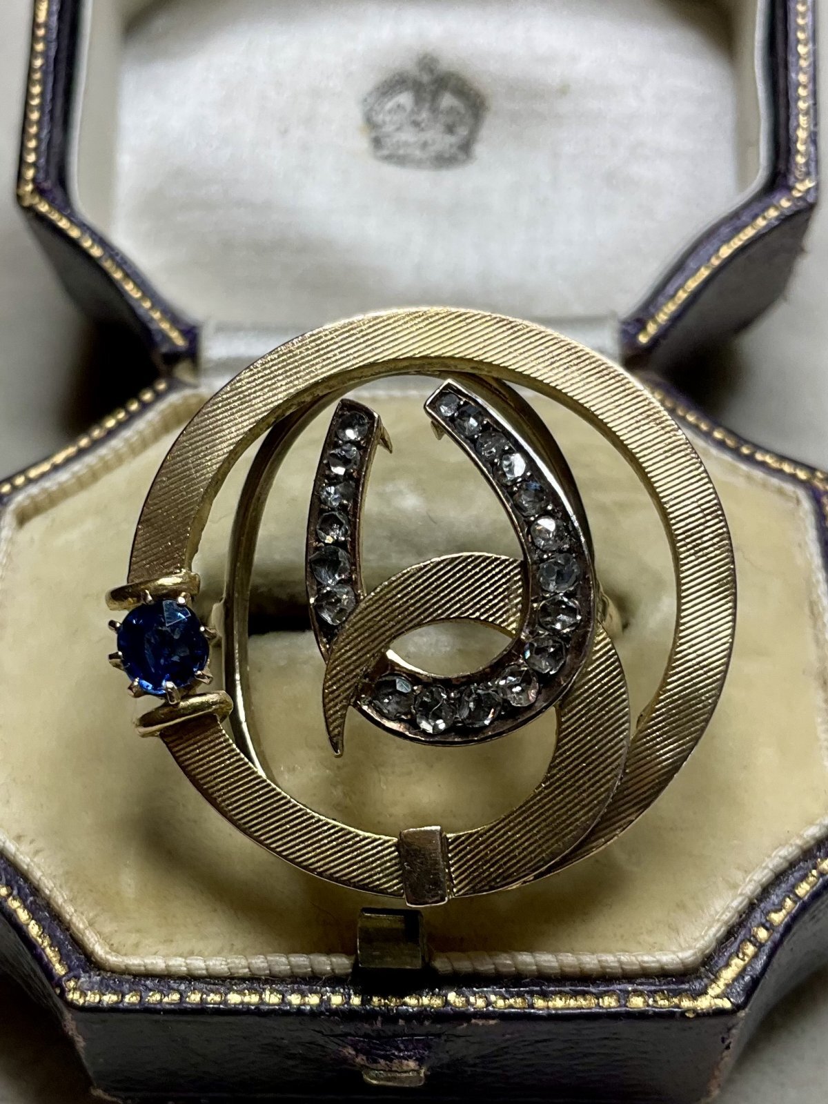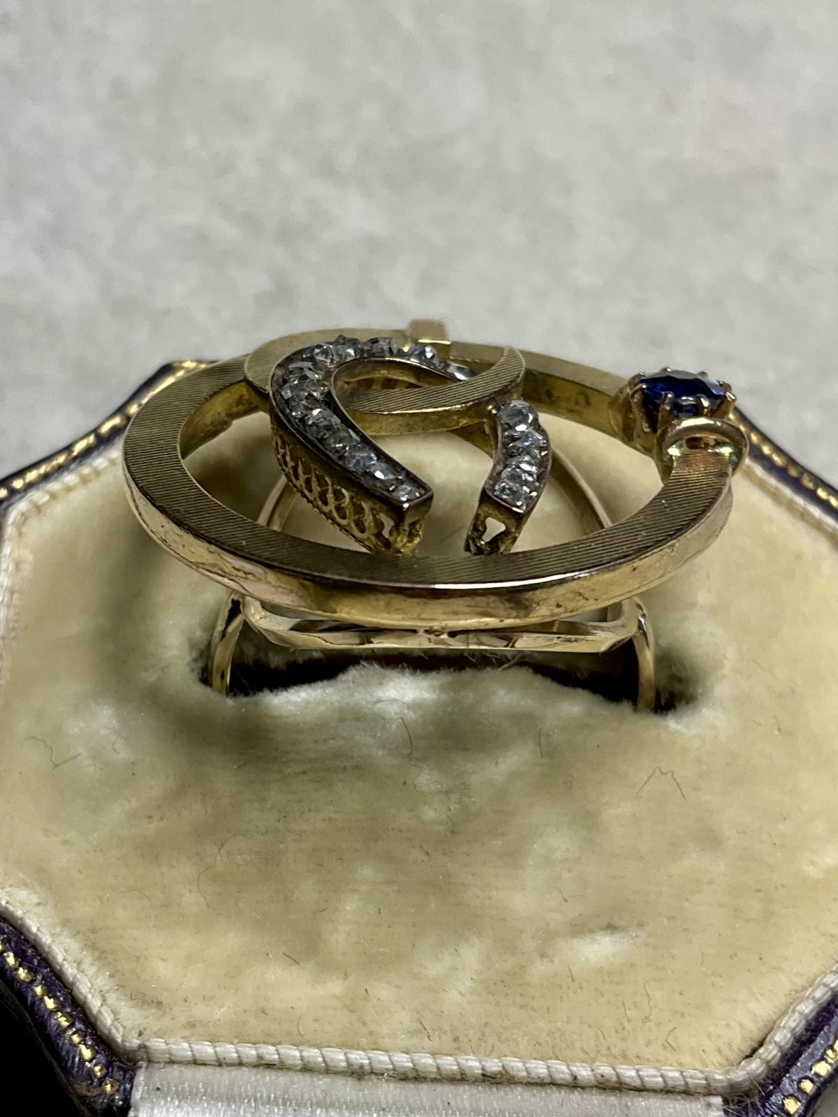 珍しいデザインの馬蹄のダイアモンド&サファイアリング1890年イギリス