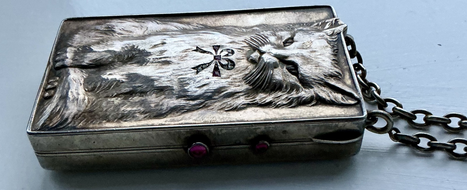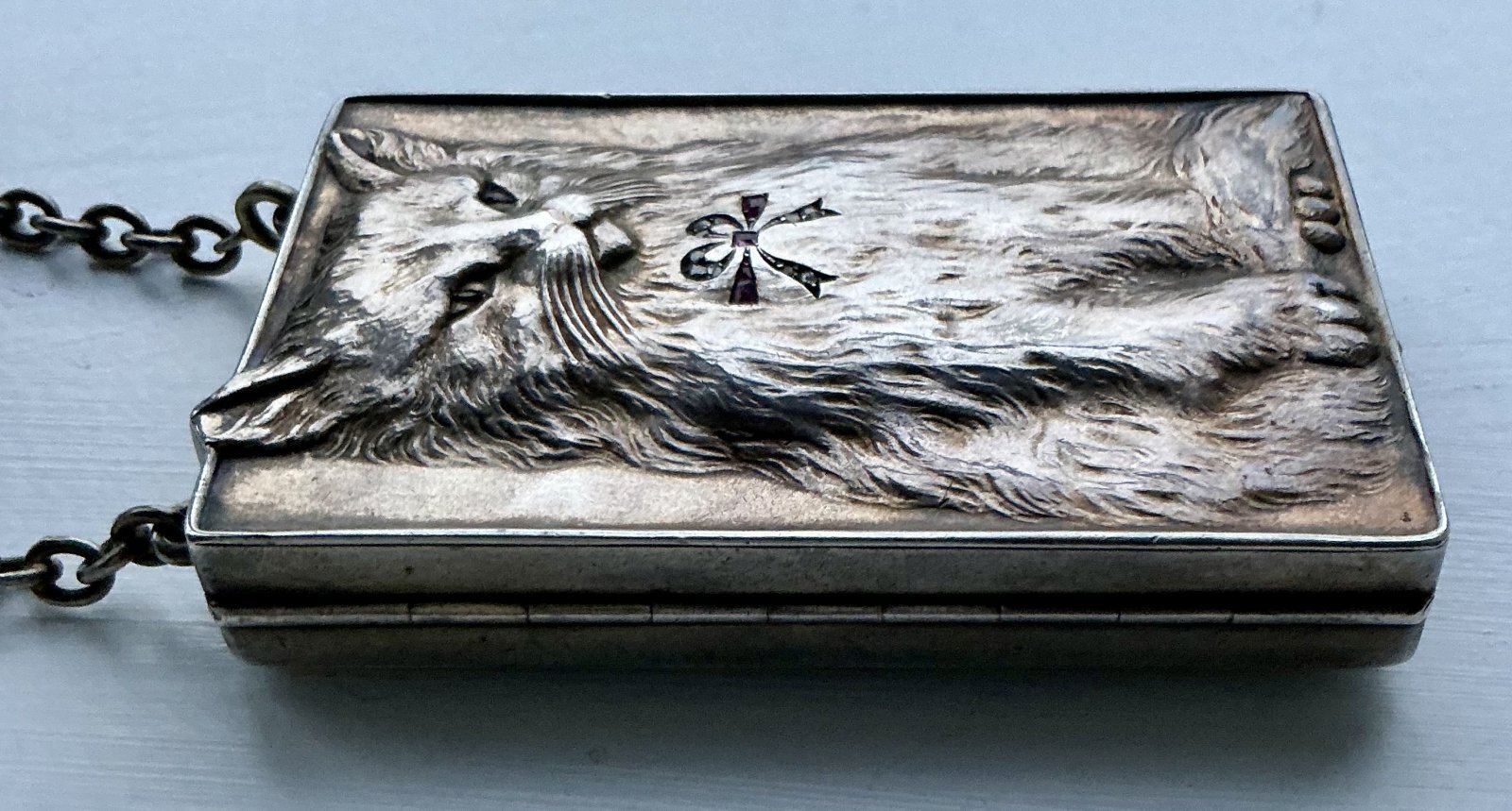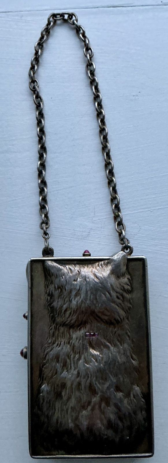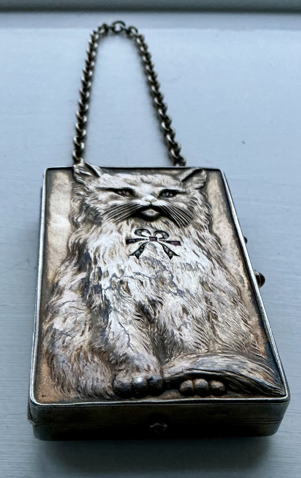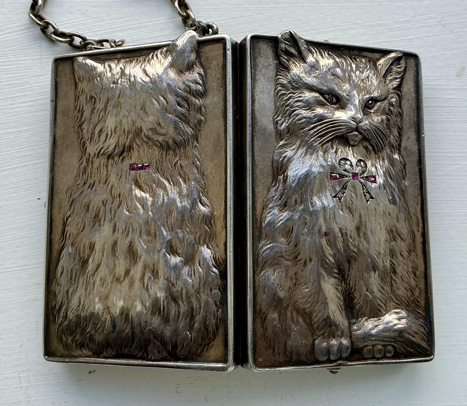 表情が素晴らしい猫のシルバーコンパクトミラーバッグ 1911年 ルイ・クッペンハイム作