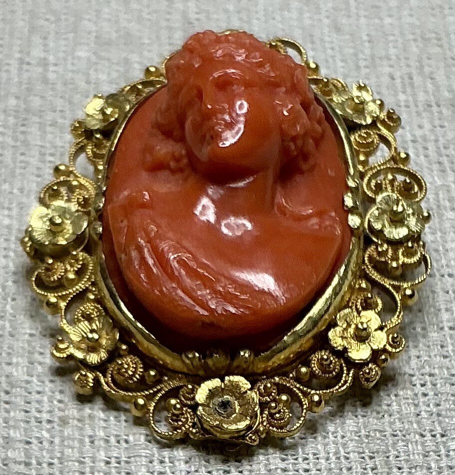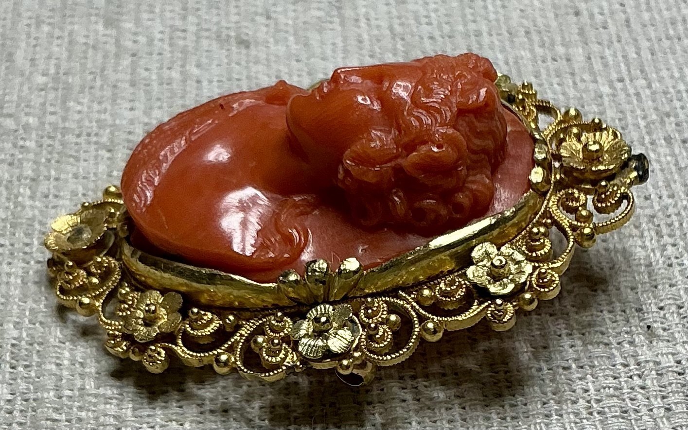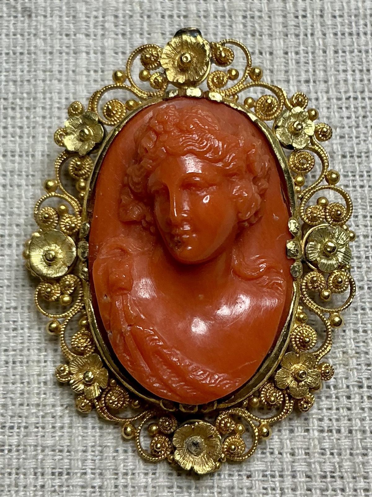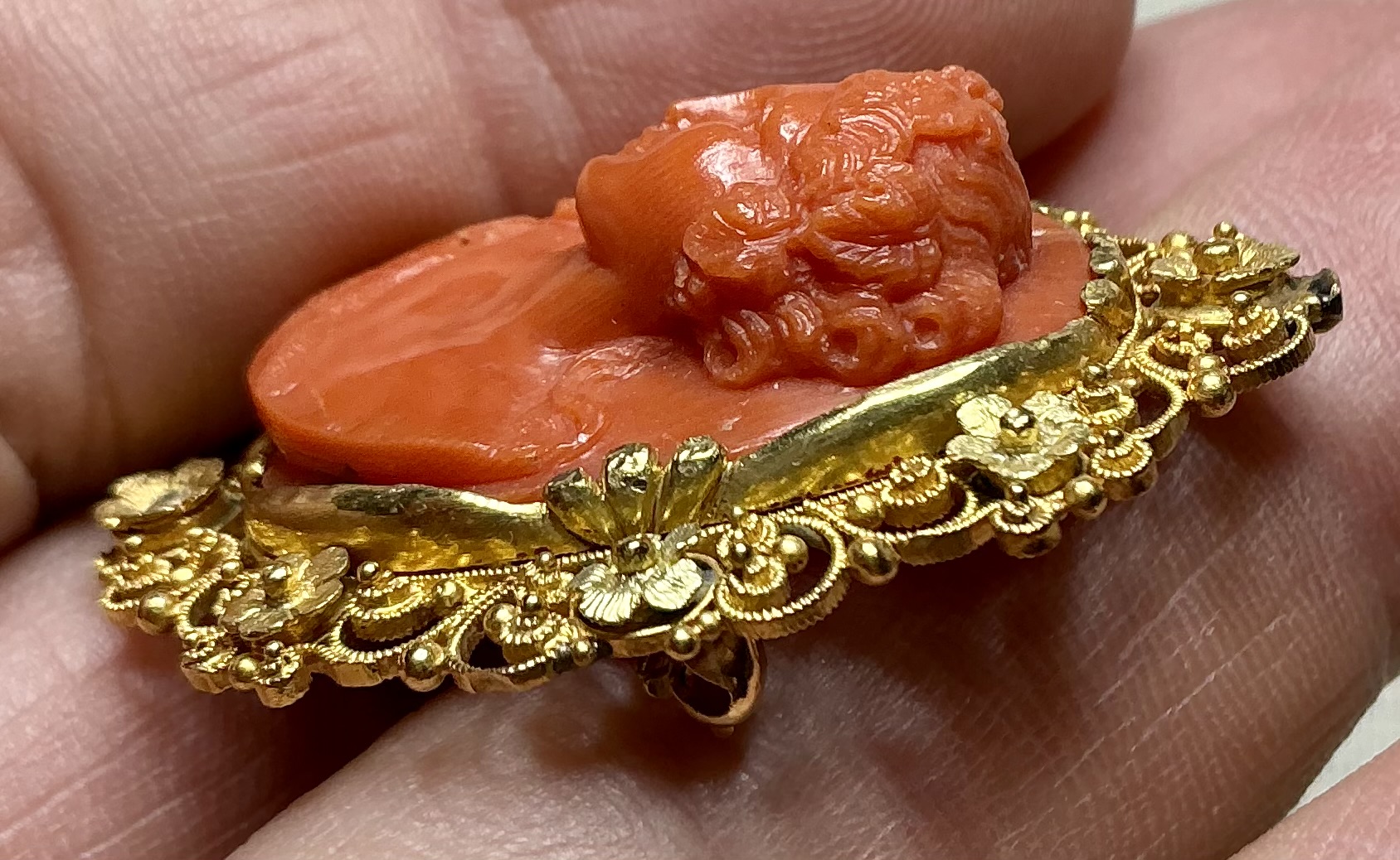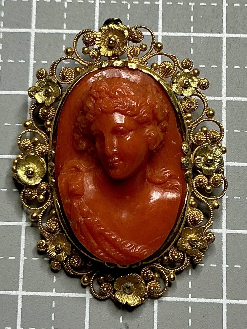 綺麗なコーラルで彫りも素晴らしく、フレームのゴールド細工も綺麗ですよ