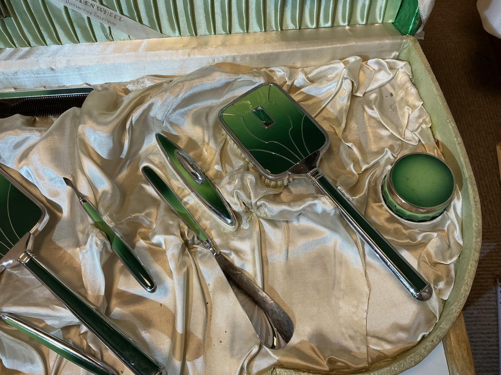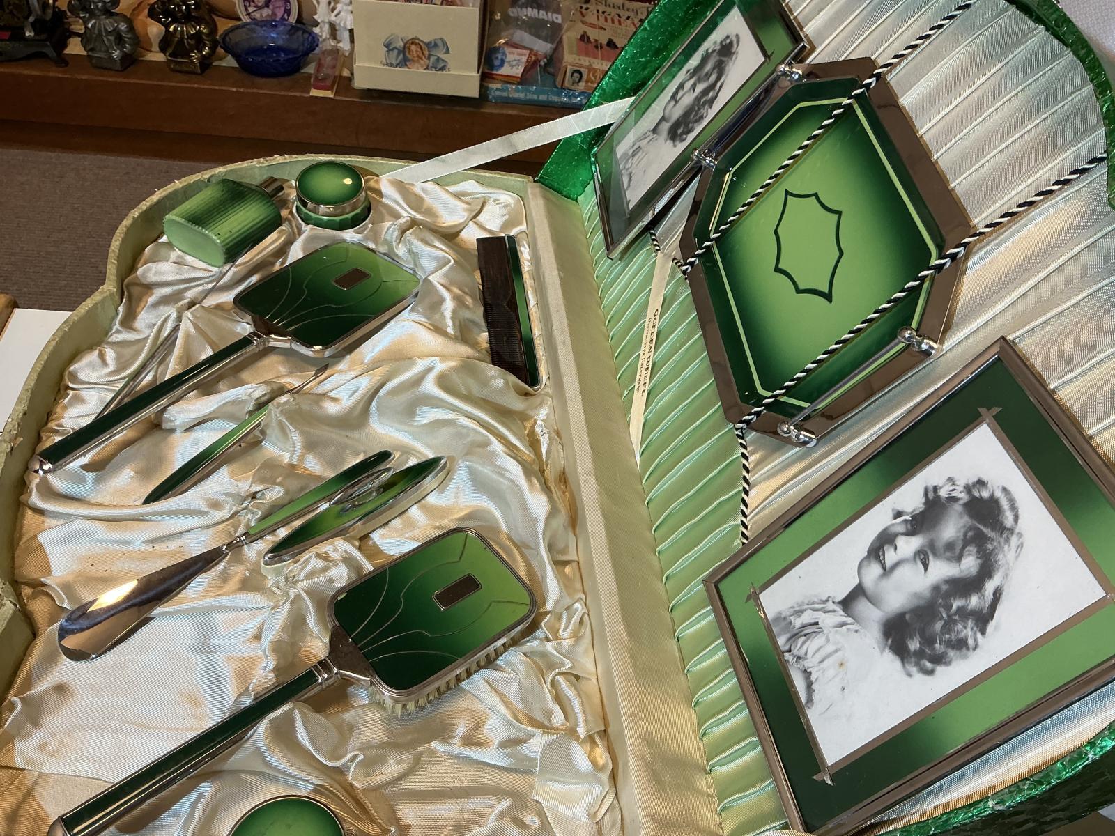テンプルの写真入り写真立て2点、トレイ、ブラシ、鏡、くし、コロンボトル、瓶、マニキュアセットなど盛りだくさんです